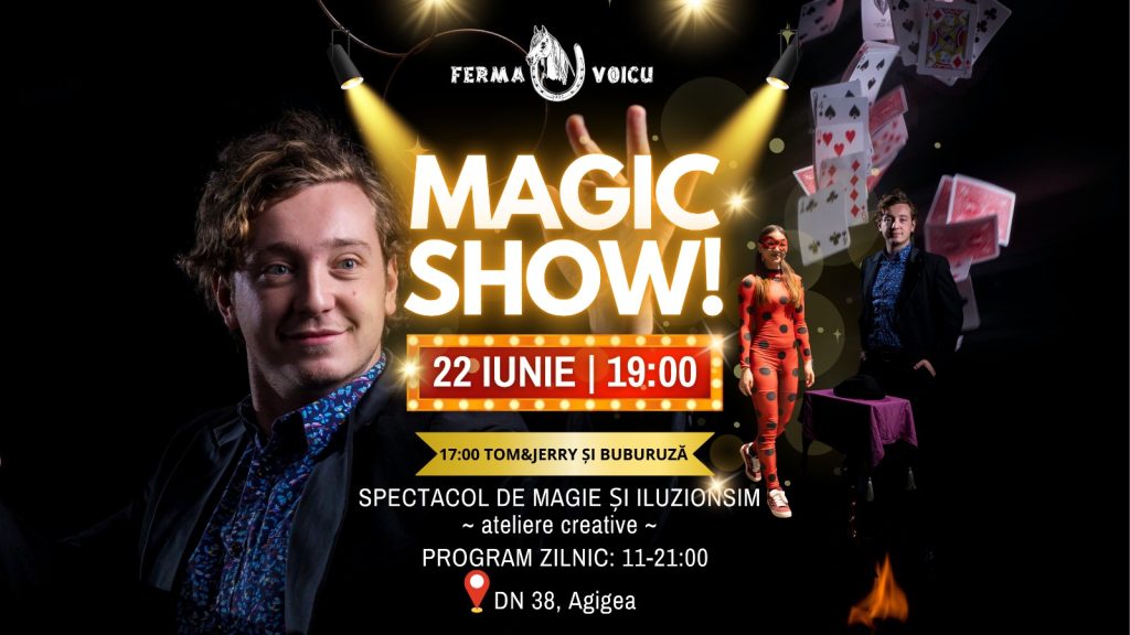 Ora 19:00 – Renumitul Magicianul Ciprian revine la Ferma Voicu și în această duminică cu un spectacol de magie și iluzionism fascinant – nu trebuie să-l ratezi! Data trecută, ne-a impresionat pe toți!