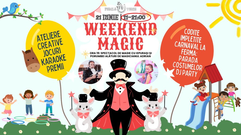 Toți copiii sunt invitați să vină costumați în personajele preferate și să se bucure de atmosfera unică a Carnavalului de la Ferma Voicu. Premiem cele mai spectaculoase costume și măști și defilăm împreună la cea mai tare paradă plină de culoare, muzică și distracție, Dj party & karaoke și o mulțime de momente interactive pentru o petrecere de neuitat!Ora 19:00: Magicianul Adrian Cuciuc vine cu un spectacol plin de surprize, iepurași și porumbei adevărați!