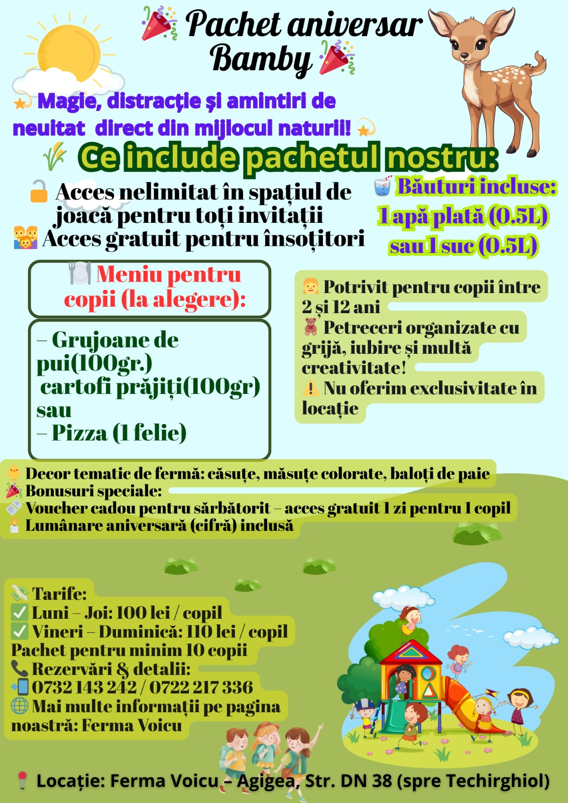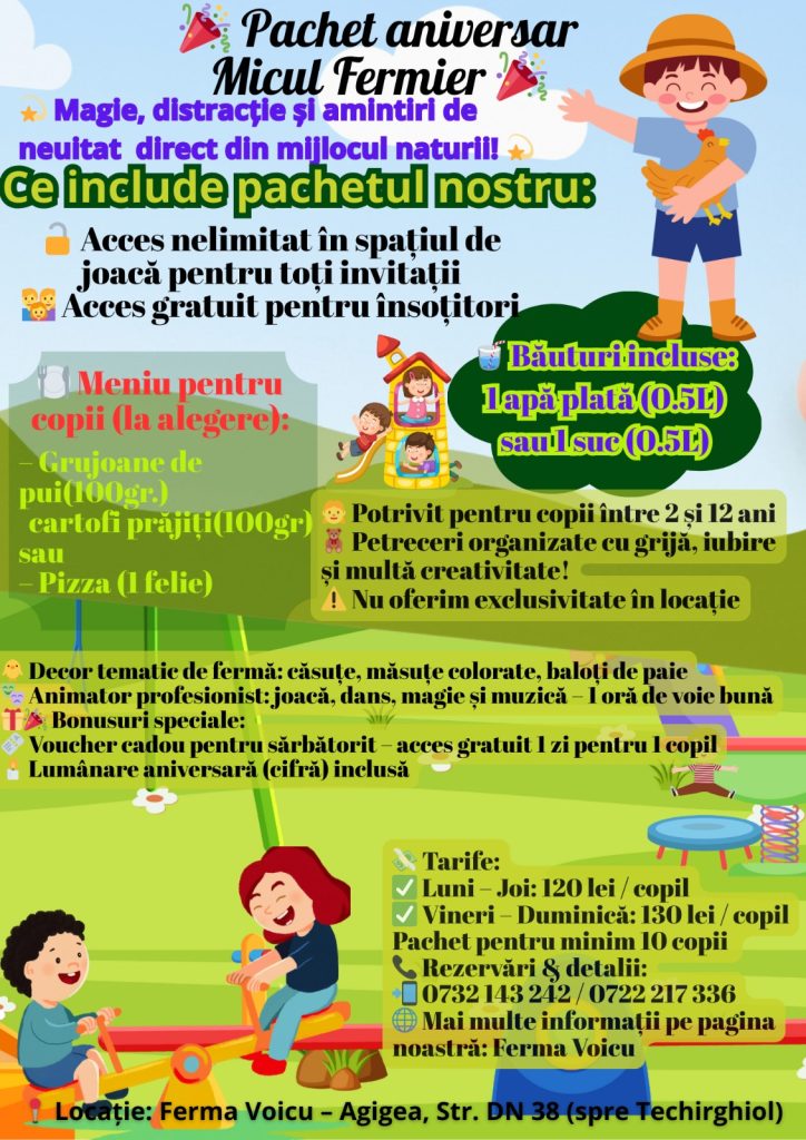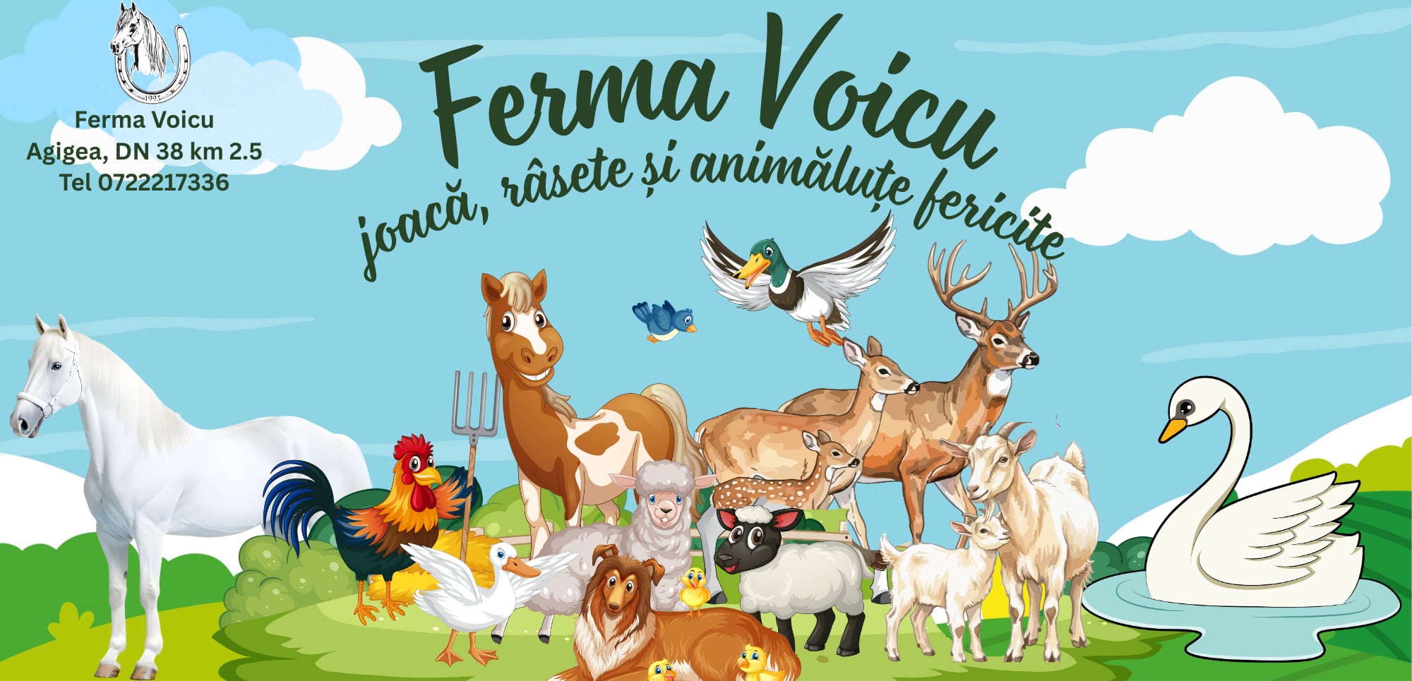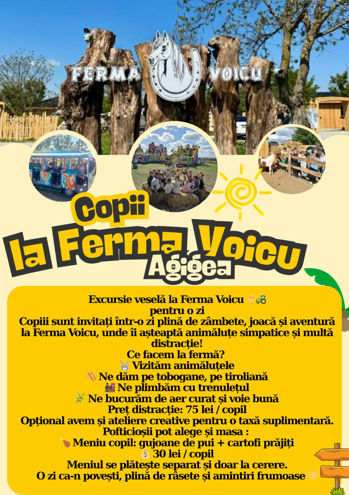 Vizitarea obiectivului turistic Ferma Voicu, situat pe o suprafata de 2 hectare,impreuna cu satul animalutelor si hranirea animalutelor. Trasee cu obstacole Diverse ateliere creative in functie de varsta copiilor : Ateliere de decupaj din lemn,Atelier de pictat sacoșe ,Atelier de pictură pe lemn – căsuțe pentru păsări ,atelier de pictat ghivece din ceramică,ateliere de decorat turta dulce,confectionat papusi din ate,Ghivece din PET-uri,etc Jocuri si concursuri pe echipe Diverse spectacole pe scena,teatru de papusi cu actori,spectacole de magie. Tiroliana mare pentru toate varstele Zona de tobogane ,zona de relaxare.In functie de vreme acces la toboganele gonflabile.